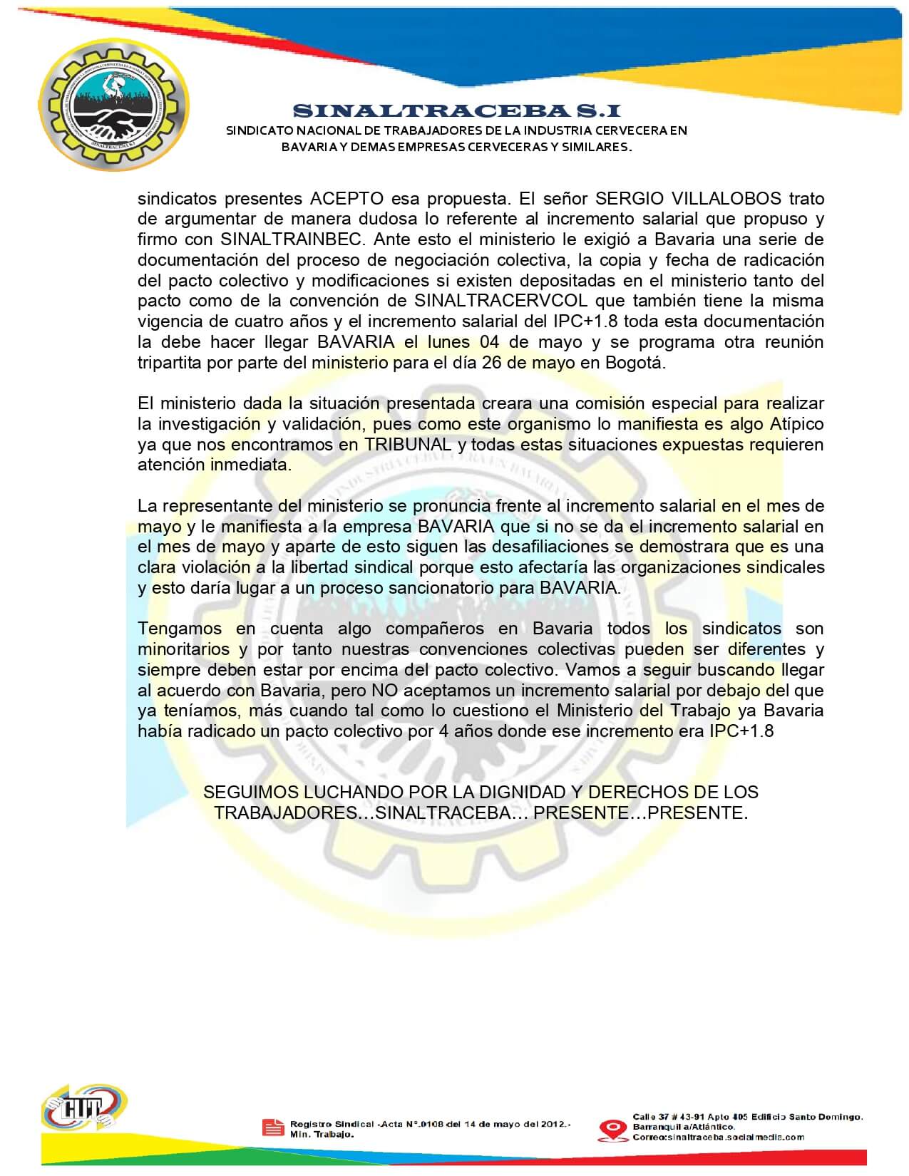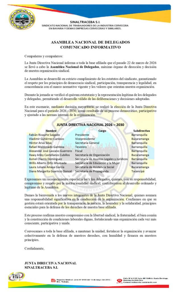 SINALTRACEBA reafirma su compromiso con la dignidad, el respeto y la justicia laboral, asumiendo este proceso con la firmeza y la convicción que siempre nos ha caracterizado.