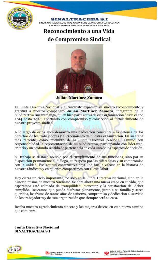 SINALTRACEBA S.I. reconoce la trayectoria sindical de Julián Martínez ZamoraPublicado por Sindicato Sinaltraceba en febrero 25, 2026febrero 25, 2026 Ejemplo de Lealtad y Constancia Sindical SINALTRACEBA S.I. reconoce la trayectoria de Julián Martínez en la Subdirectiva Bucaramanga y en la Junta Directiva Nacional, destacando un compromiso firme que fortaleció nuestra organización con respeto, unidad y principios. Categorías: ActualidadSociales Subscribirse Notificar de new replies to my comments Label {} [+] Nombre* Email* Δ Label {} [+] Nombre* Email* Δ 0 Comentarios Lo más antiguo Lo más reciente Comentarios en línea Ver todos los comentarios